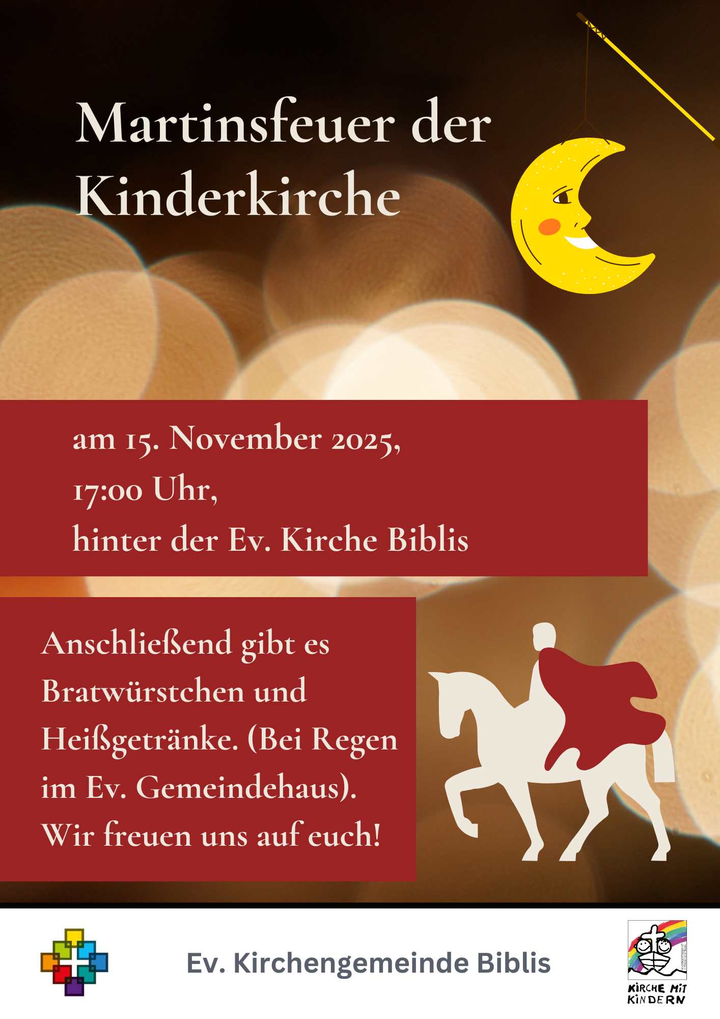Das Martinsfeuer der Kinderkirche findet von 17:00 - 18:30 Uhr hinter der Kirche statt.