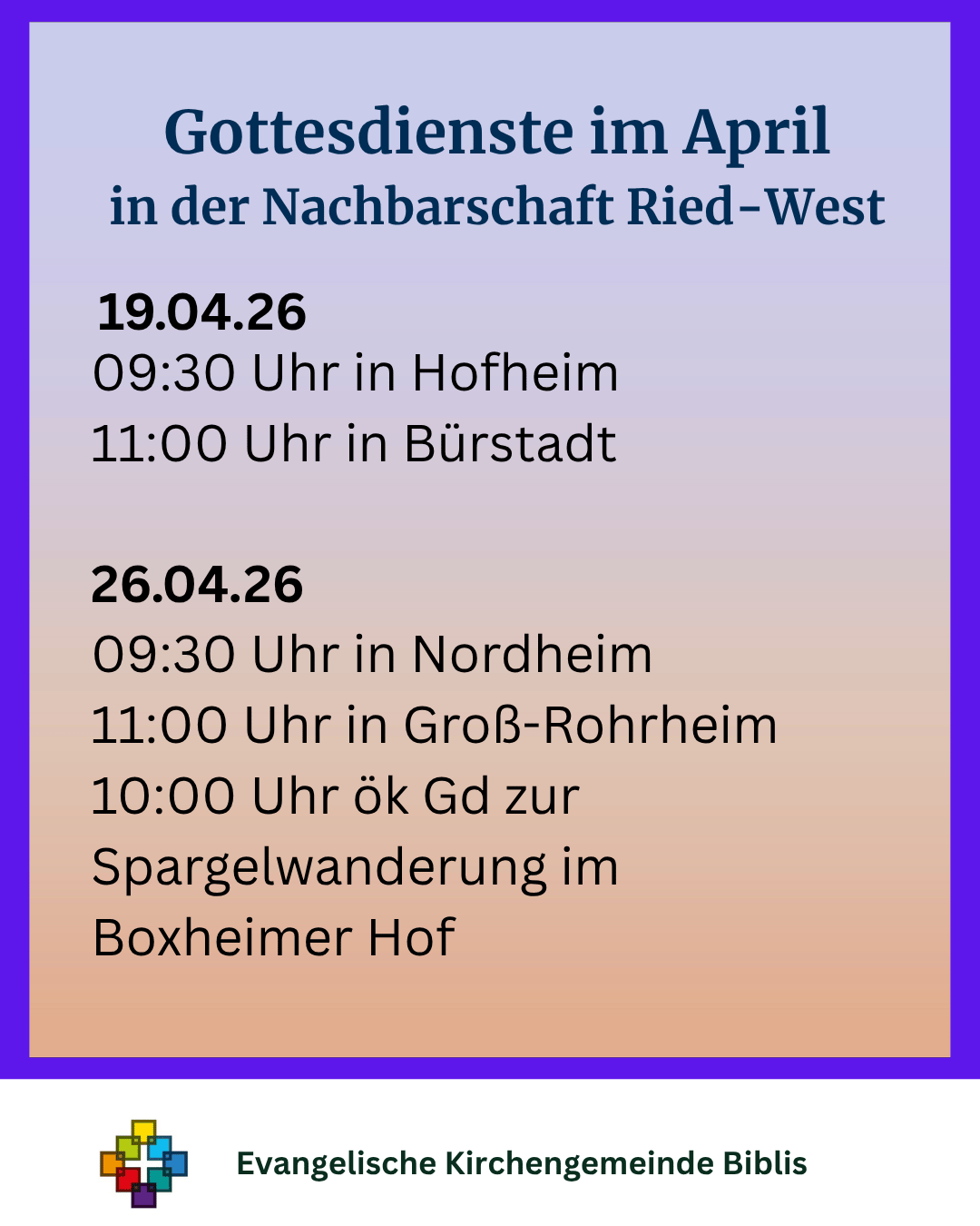 Die Ev. Kirchengemeinde Biblis bildet mit den Kirchengemeinden von Nordheim, Groß-Rohrheim, Hofheim, Bobstadt und Bürstadt die Nachbarschaft Ried-West.