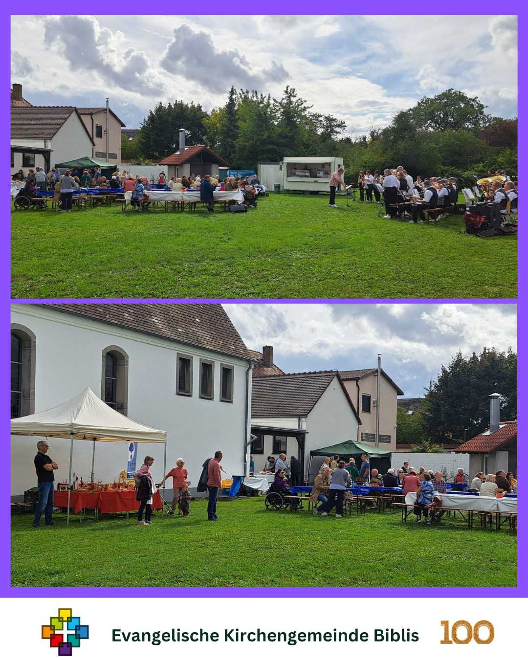 Auf der Pfarrwiese begeisterte die Bibliser Brassband mit einem zweistündigen Konzert. Für das leibliche Wohl war bestens gesorgt: Bratwürstchen, Salate, ein Lángos-Stand und erfrischende Getränke ließen keine Wünsche offen. Die Regentropfenwerkstatt aus Hofheim bereicherte das Fest mit einem Holzkunst-Stand.