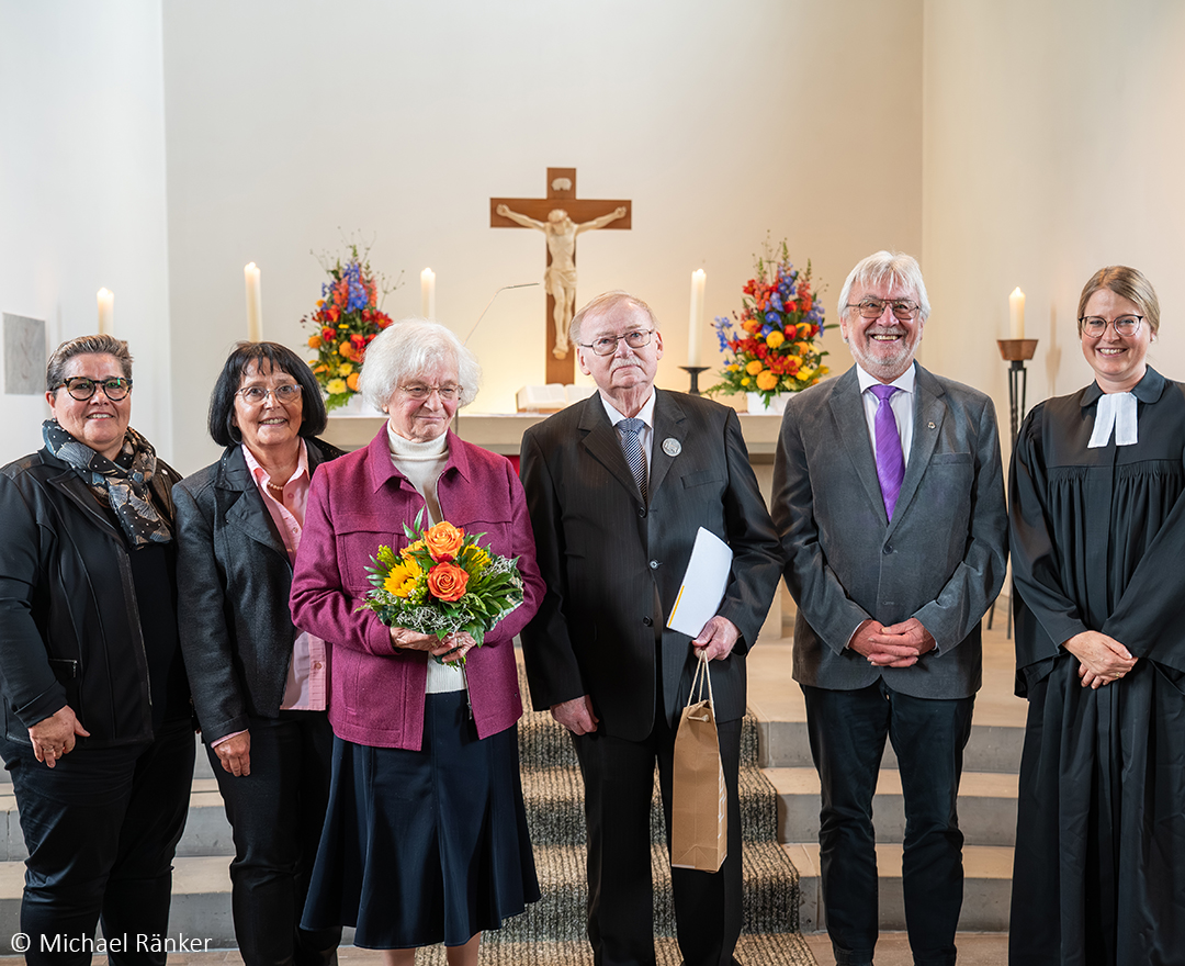 Unser Bild zeigt Helmut Loof (4.v.l.), den Träger der Starkenburgmedaille, zusammen mit (v.l.) Laudatorin Sabine Karb, Präses Ute Gölz (Vorsitzende der dekanatseigenen Stiftung), Ehefrau Pia Loof, Harald-Udo Kouba (Mitglied des Vorstands der dekanatseigenen Stiftung) sowie Dekanin Sonja Mattes.